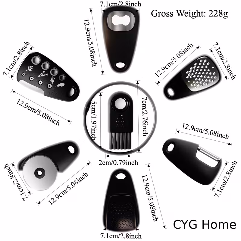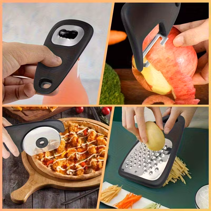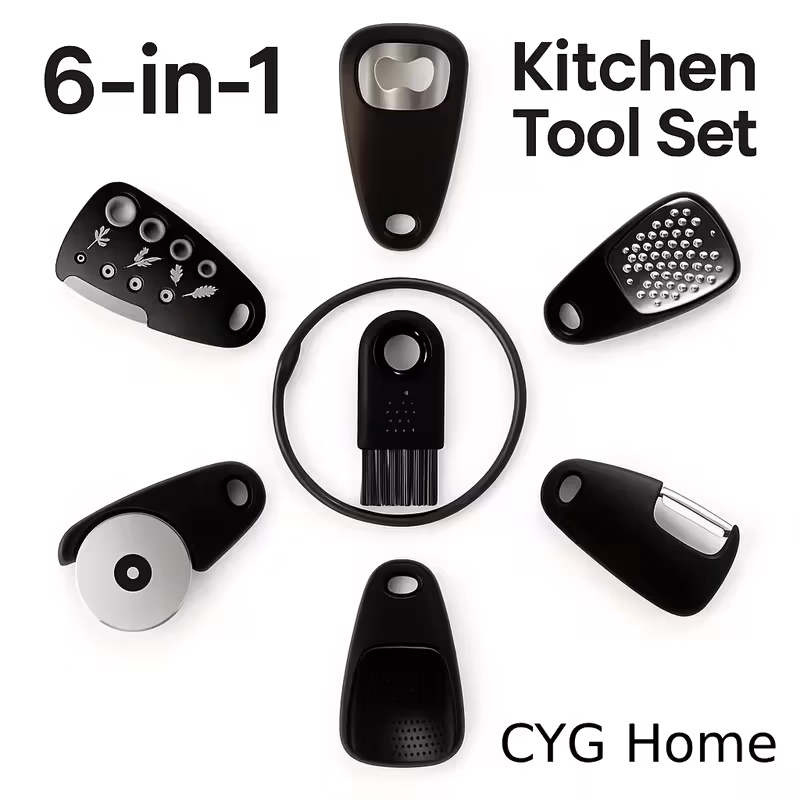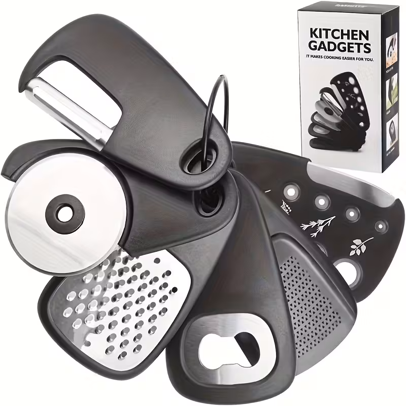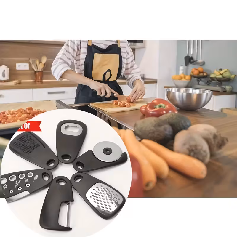 6 أدوات مطبخ أساسية مجمّعة في تصميم واحد موفّر للمساحة وسهل الحمل، مناسب للبيت، السفر، الشوي، والكيمبينج.