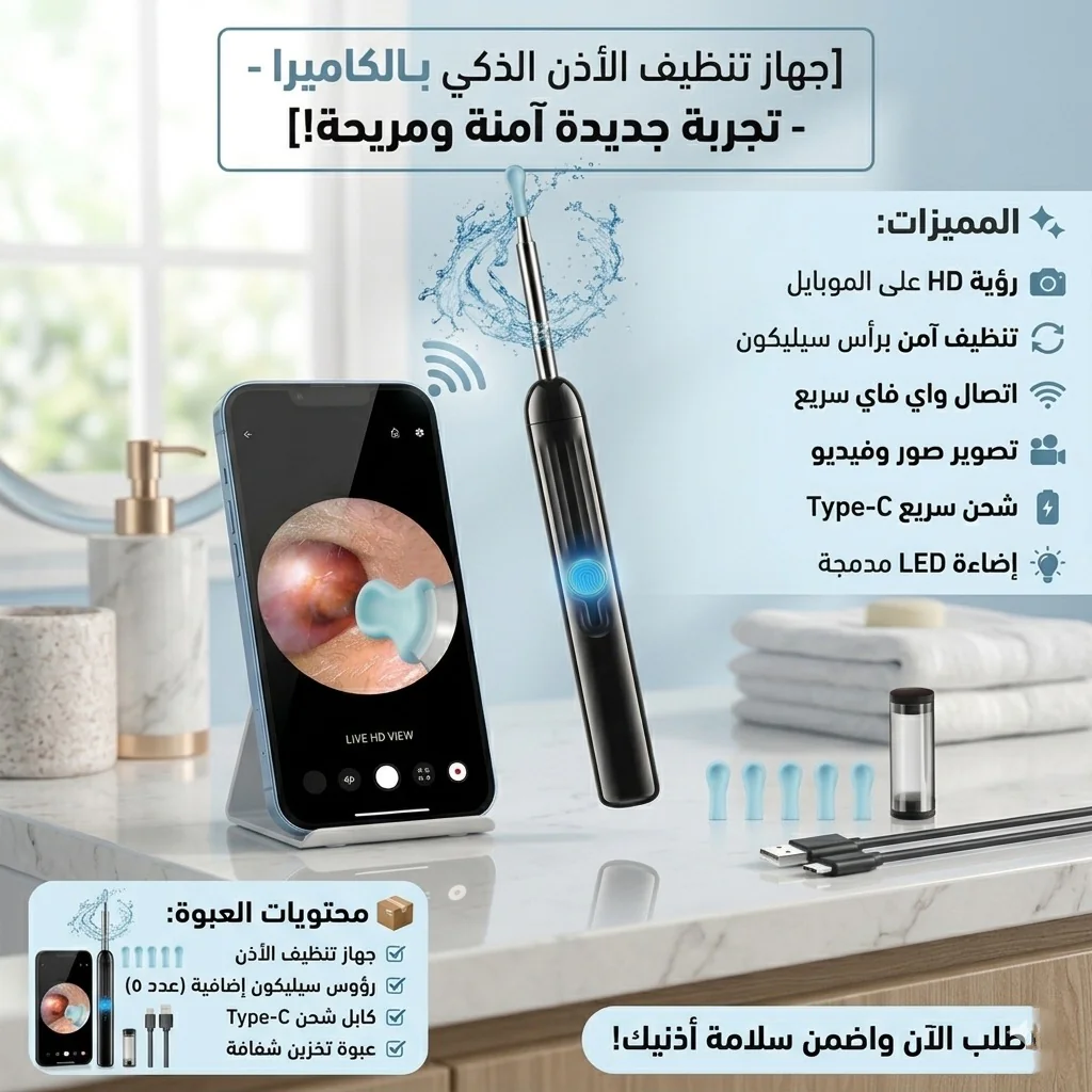 لو بتعاني من تنظيف ودنك بالطريقة التقليدية ومش شايف بتعمل إيه، الجهاز ده هيغيّرلك التجربة تمامًا! جهاز تنظيف الأذن الذكي بالكاميرا بيديك رؤية واضحة من جوه ودنك على الموبايل، عشان تنظف بأمان ومن غير أي قلق.